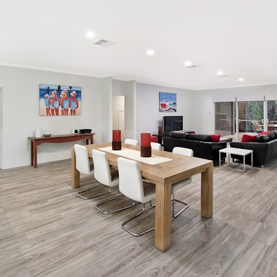 An open plan living area consisting of dining table and chairs; three seater and two seater lounges with two ottomans, flat screen TV and DVD Player, leading out through sliding doors to the decked alfresco area.