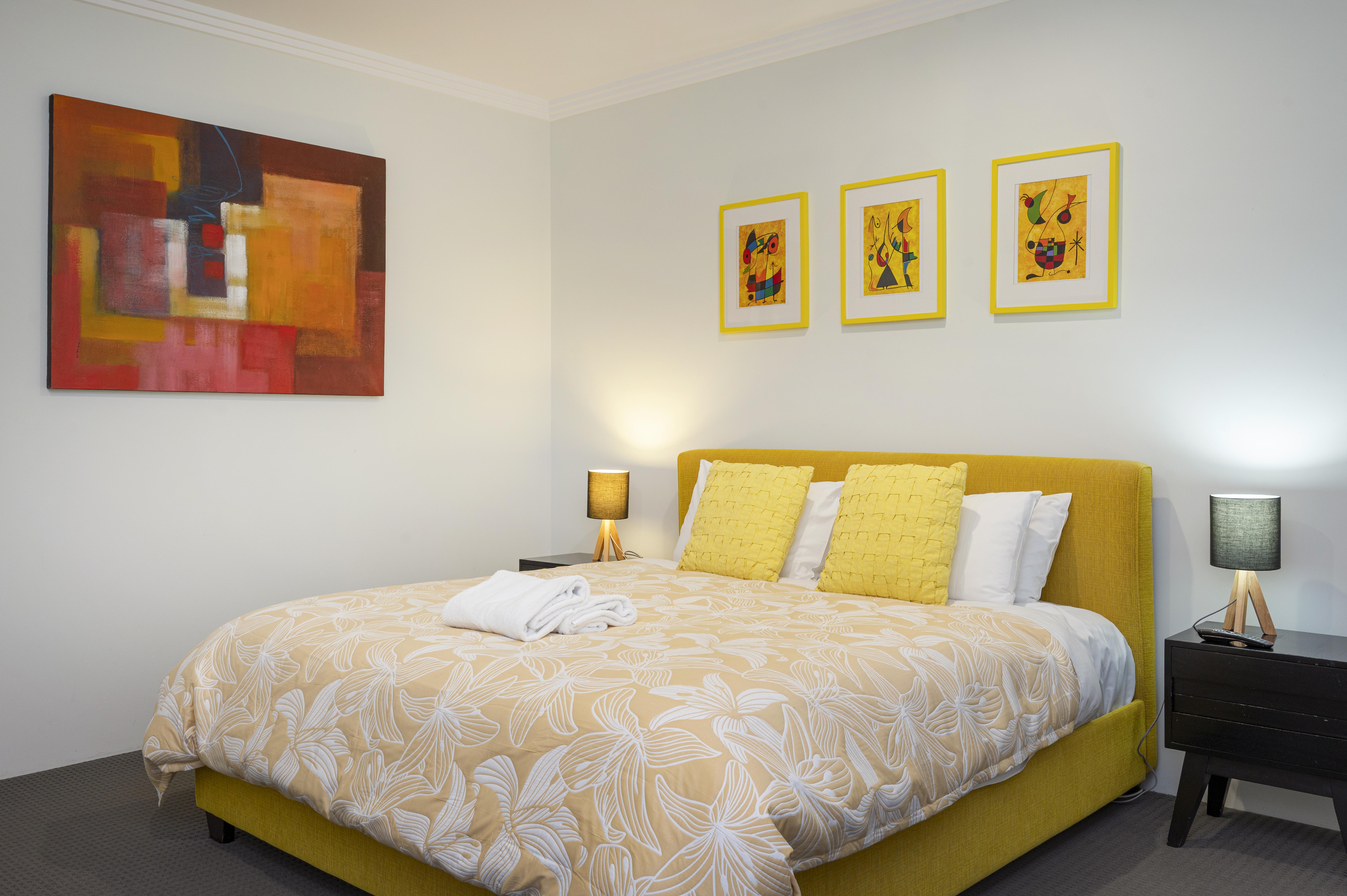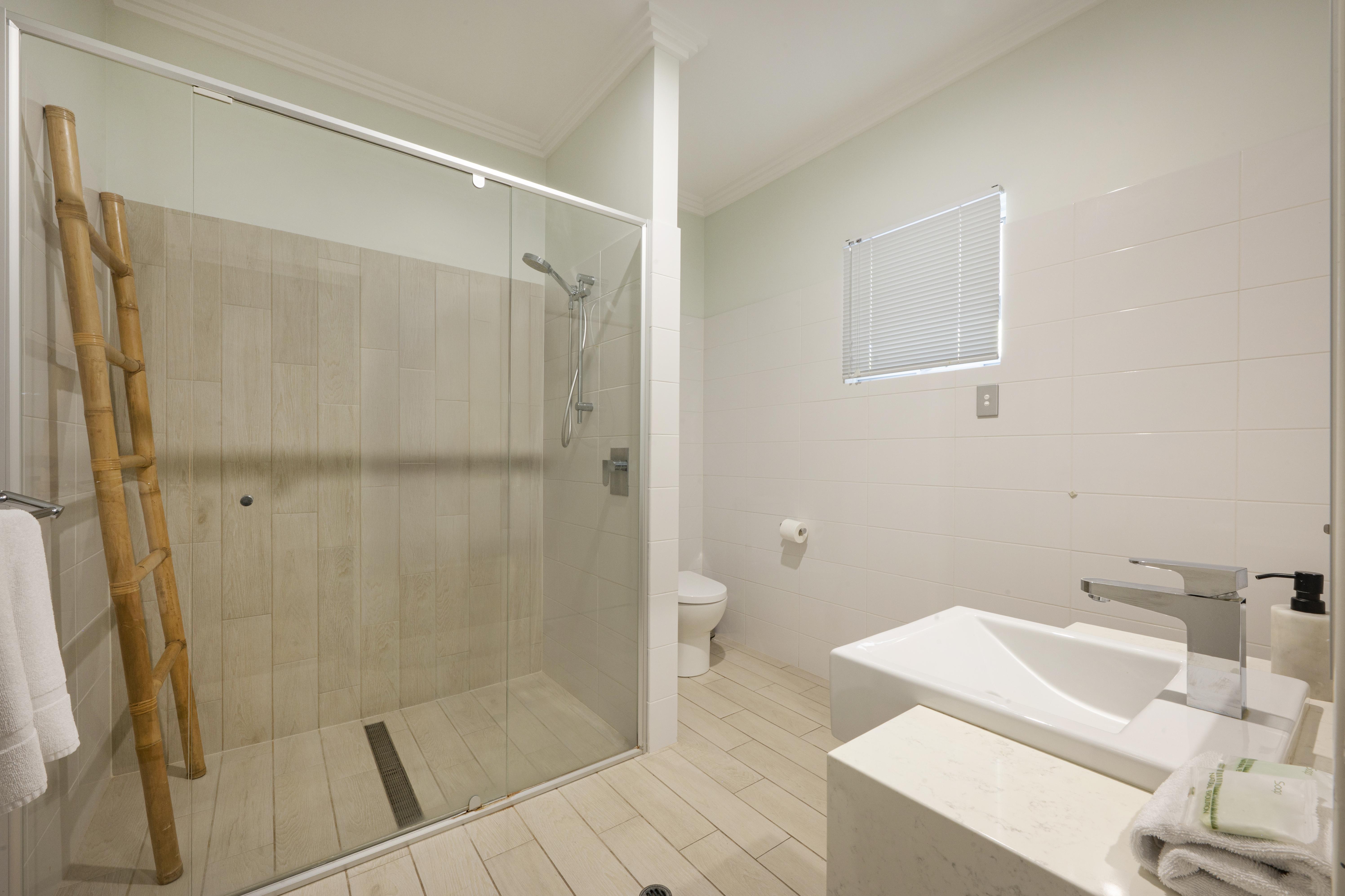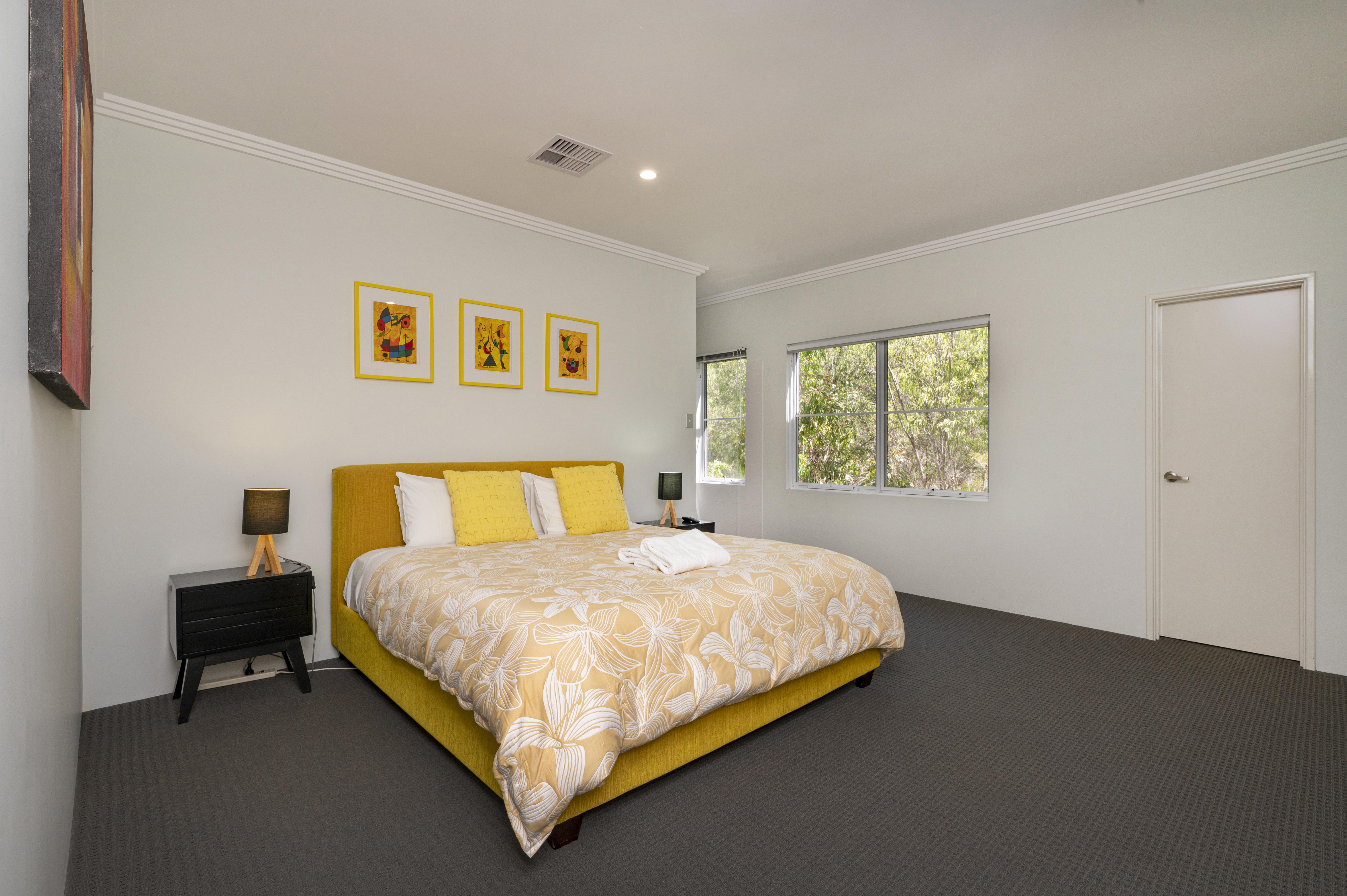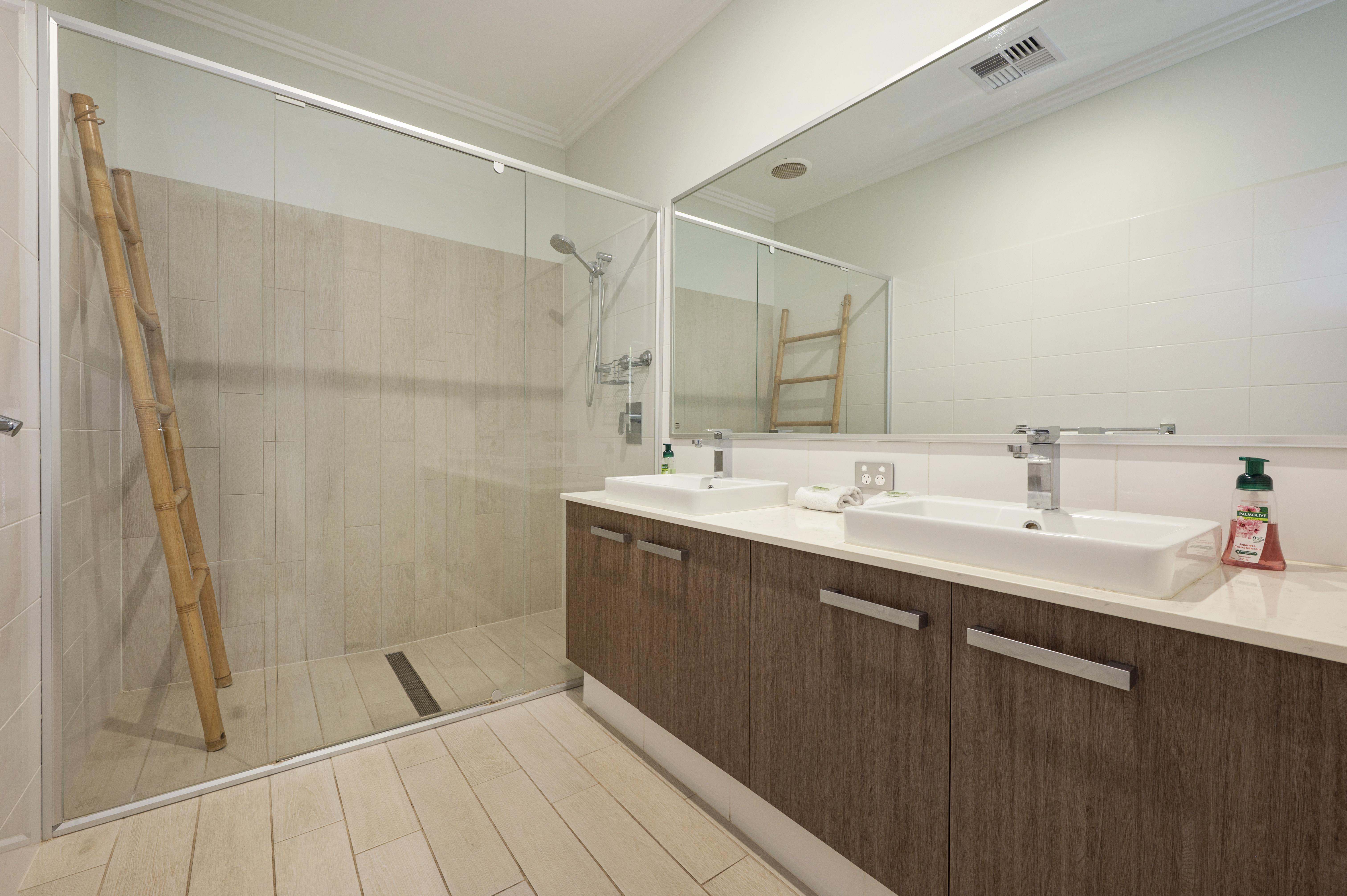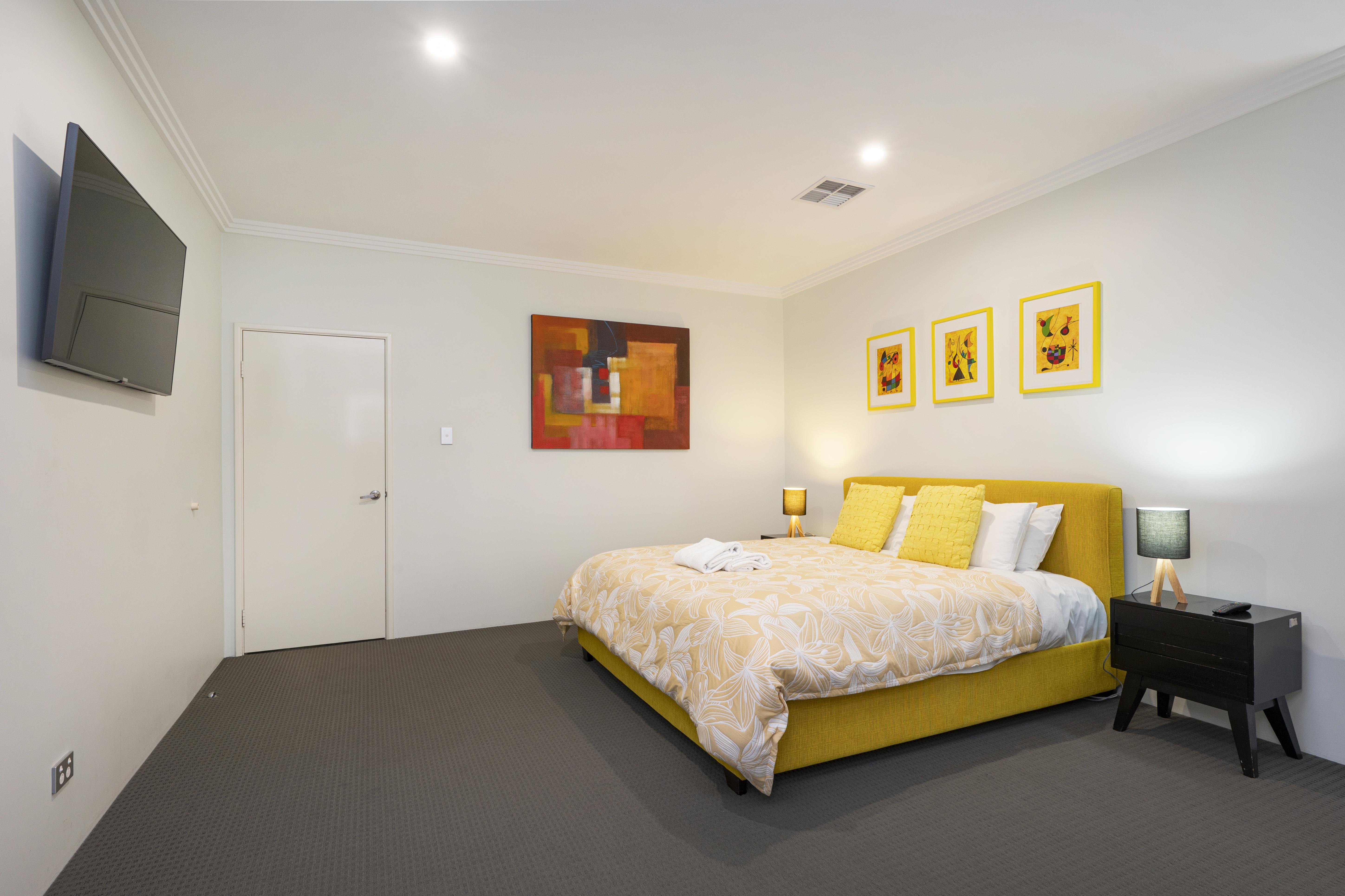 The main bedroom has a king size bed, bedside tables and lamps with a wall mounted TV, and ensuite with large shower, double vanity and separate toilet.