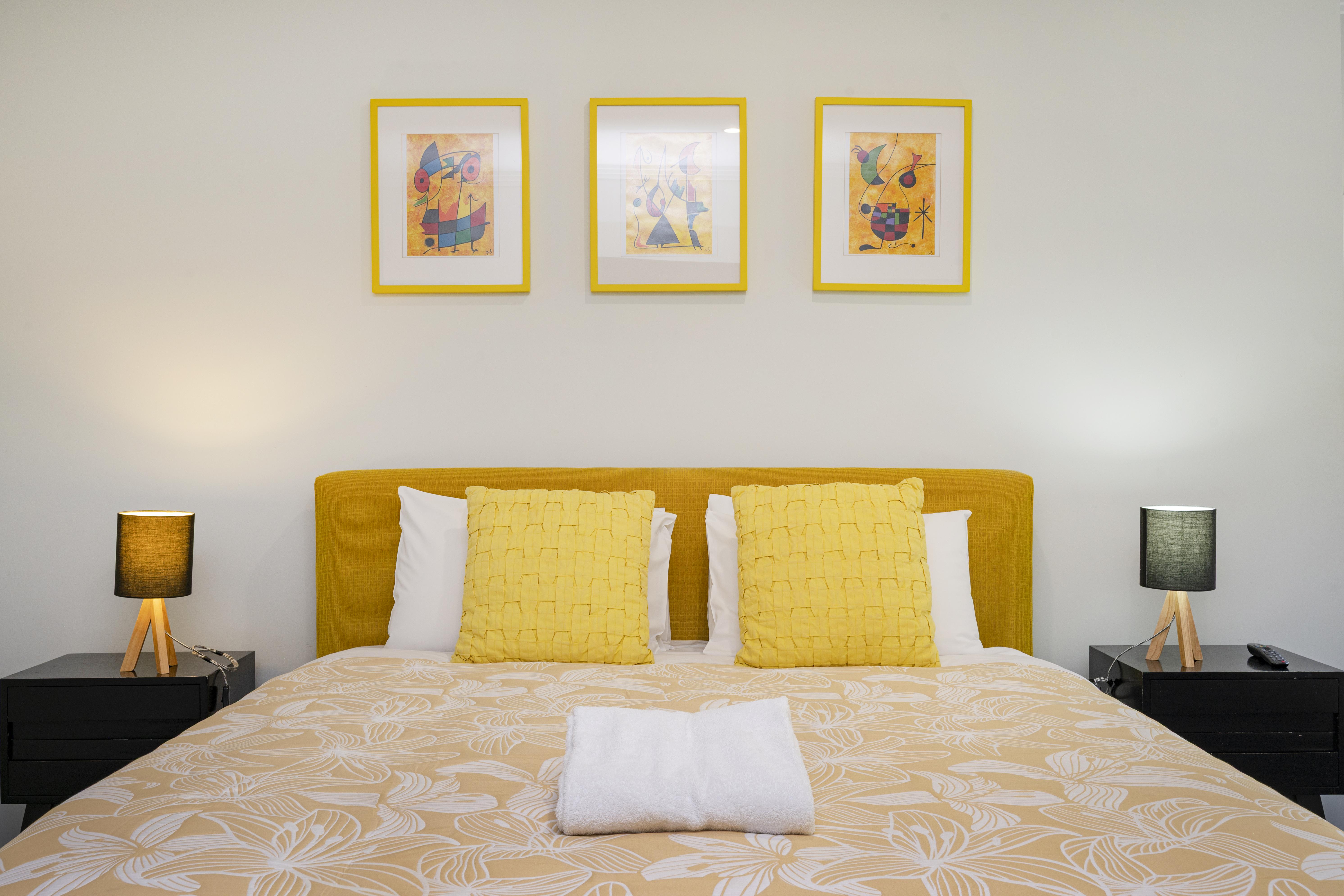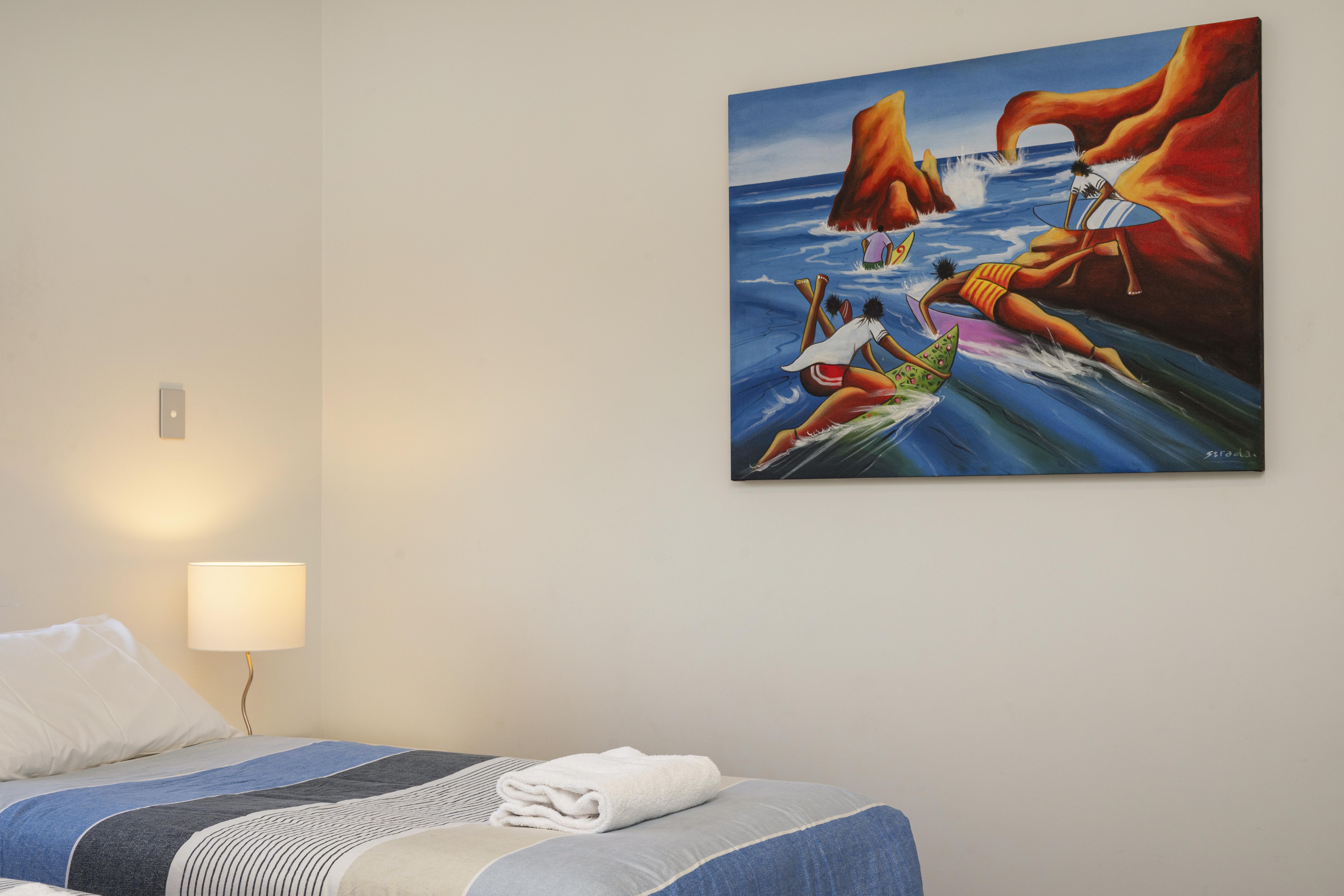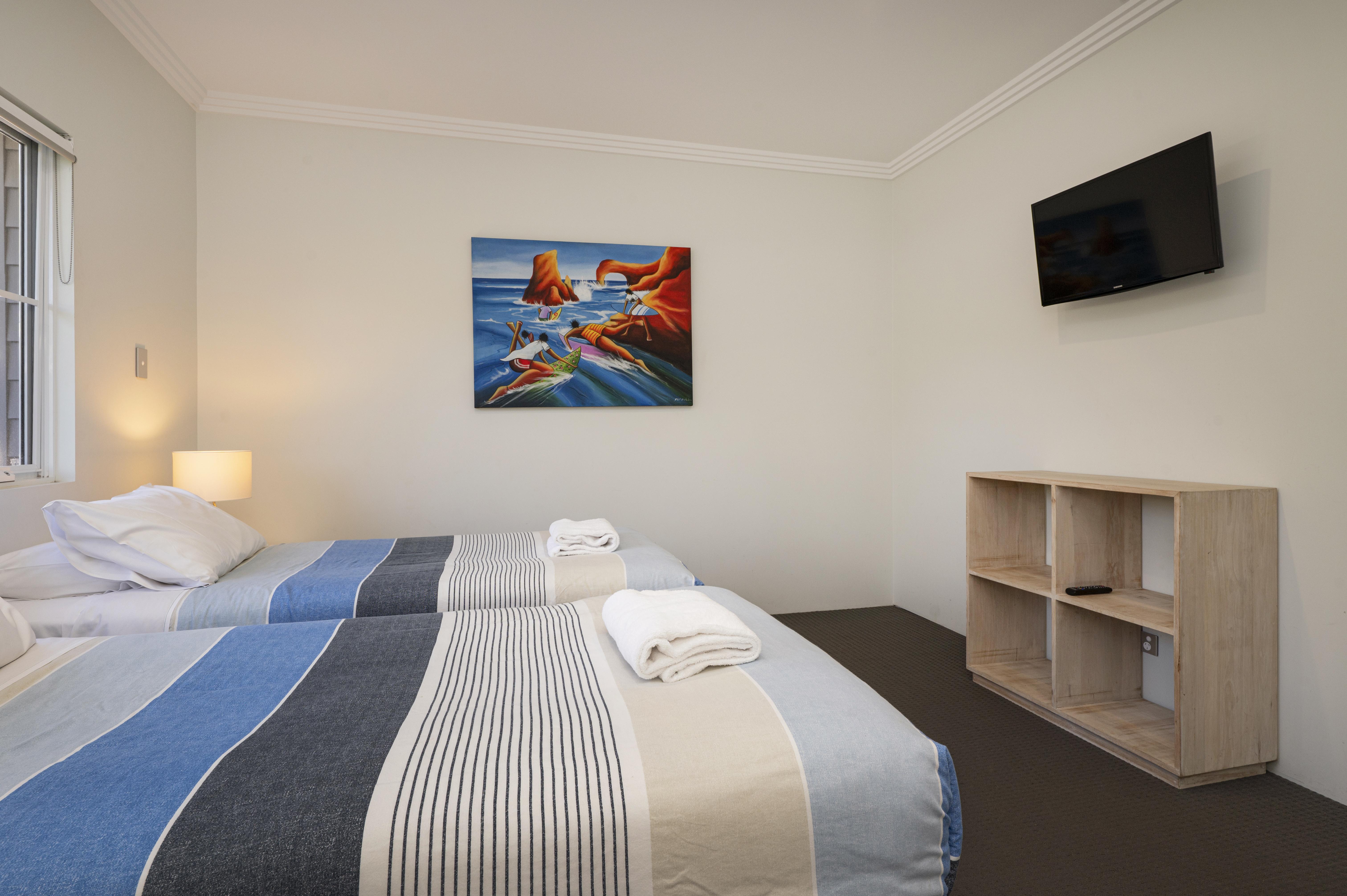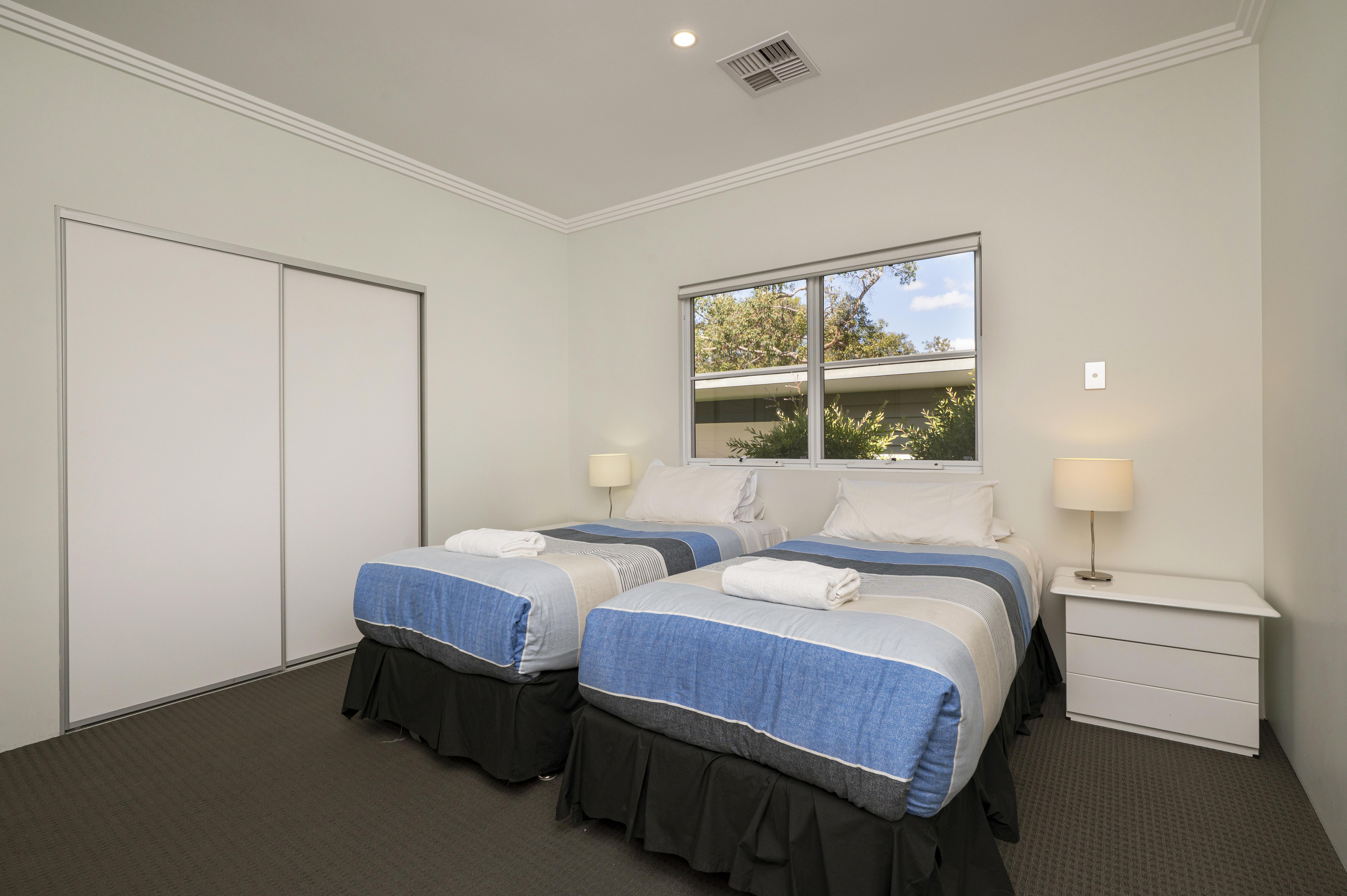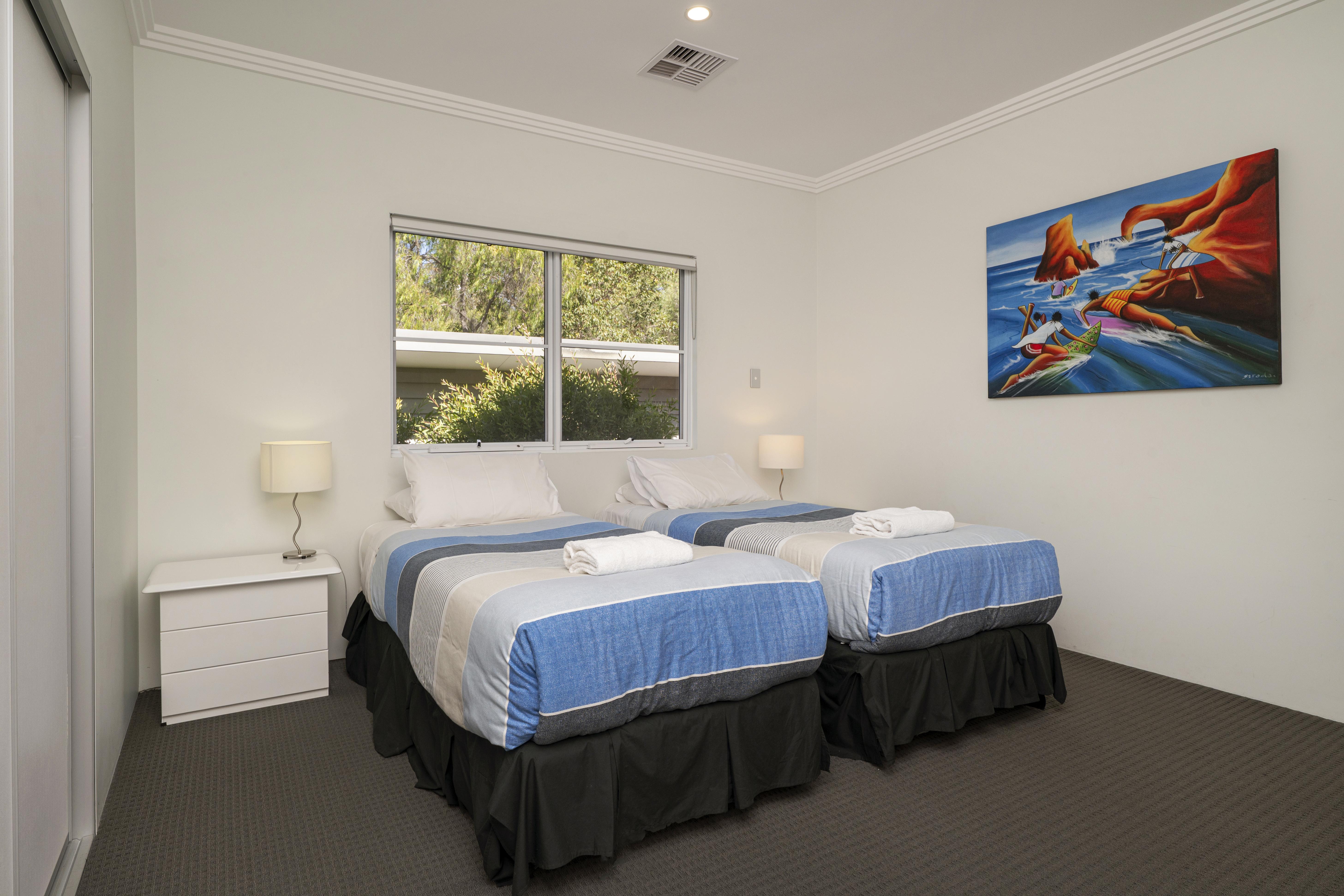 The second bedroom has two king single beds (can be joined together as a king bed) bedside tables and lamps, and wall mounted TV with a semi-ensuite.