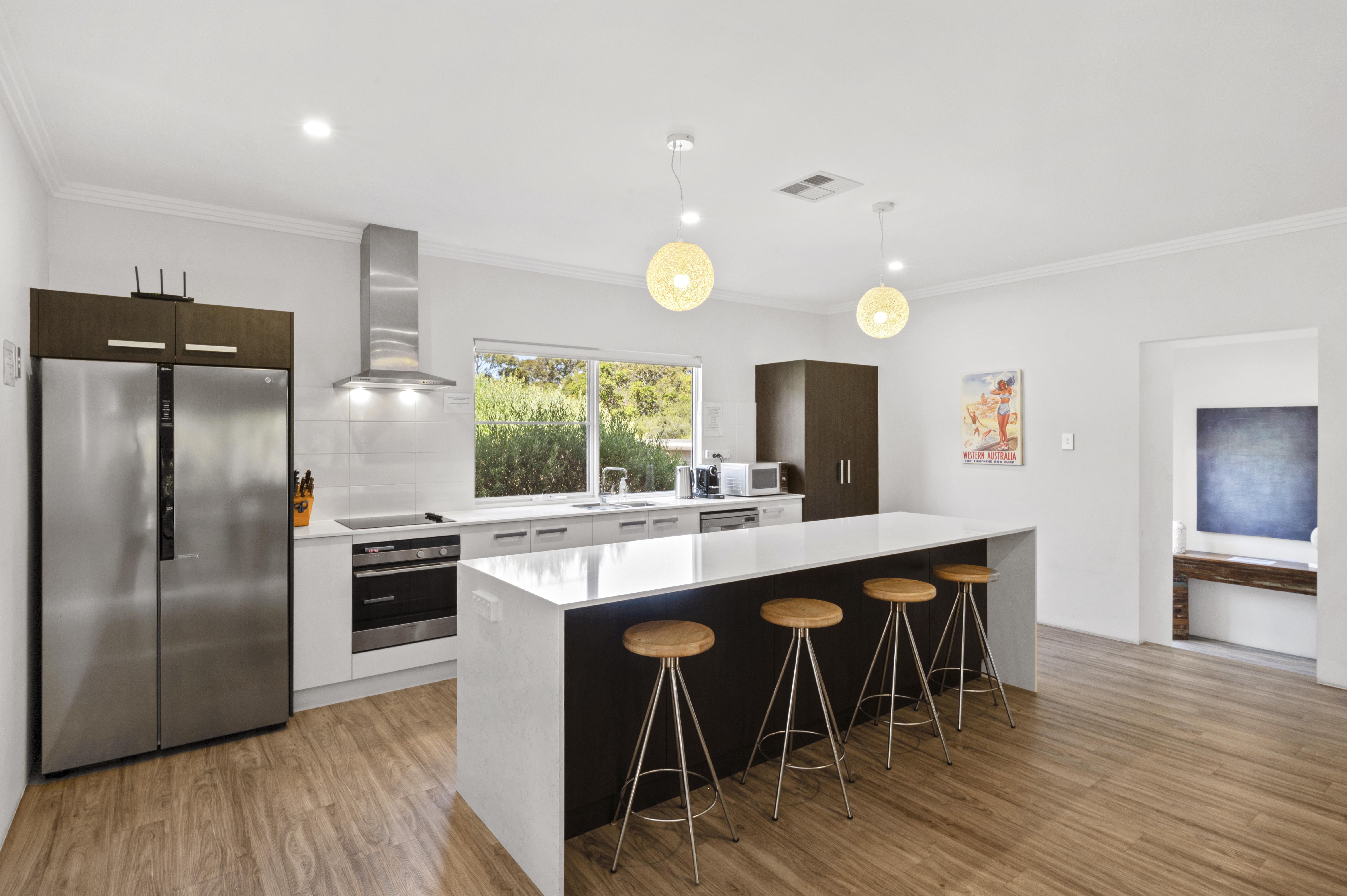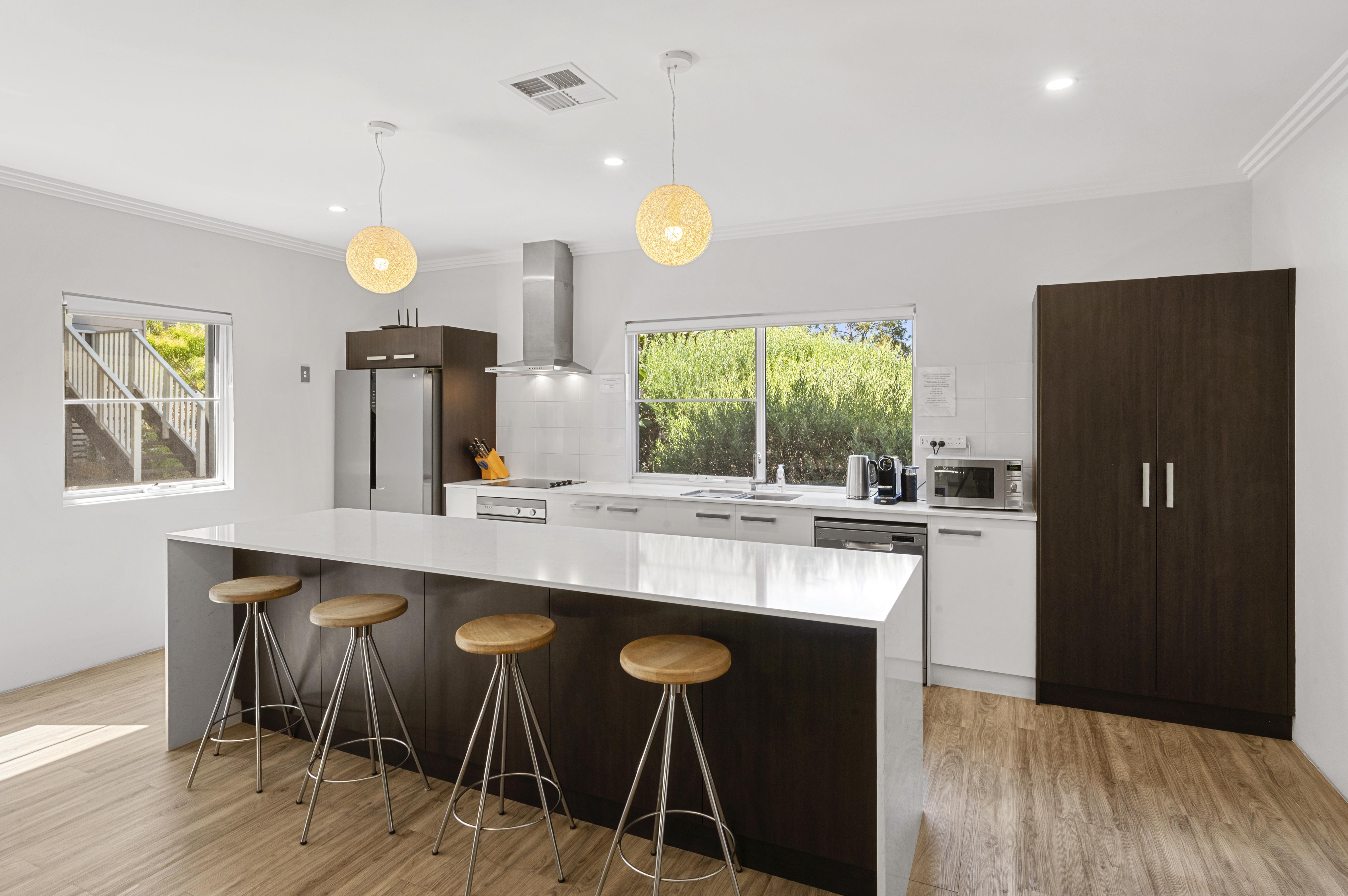 The kitchen features modern appliances, a fridge, microwave, dishwasher, oven & hotplate, plenty of crockery & cookware.