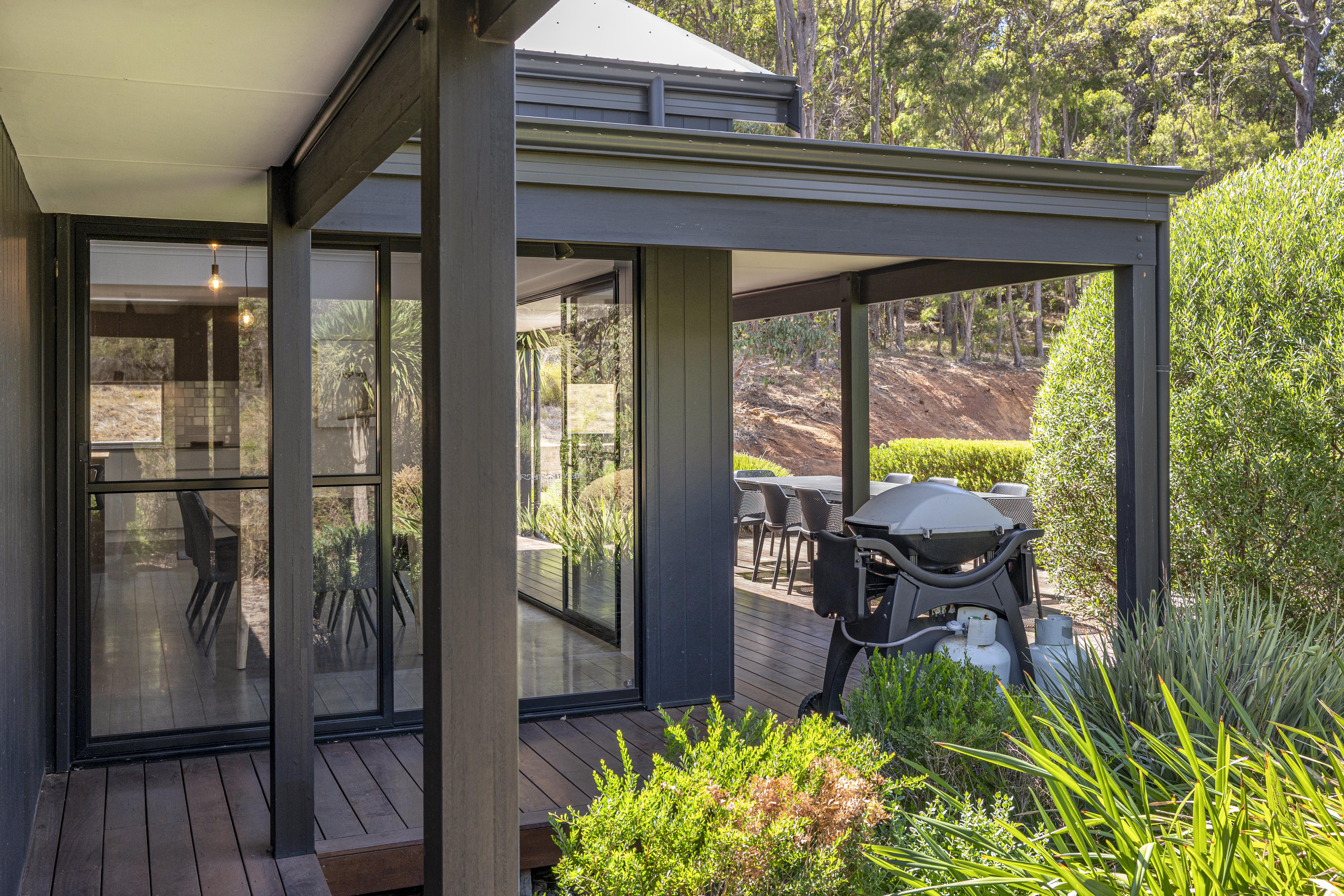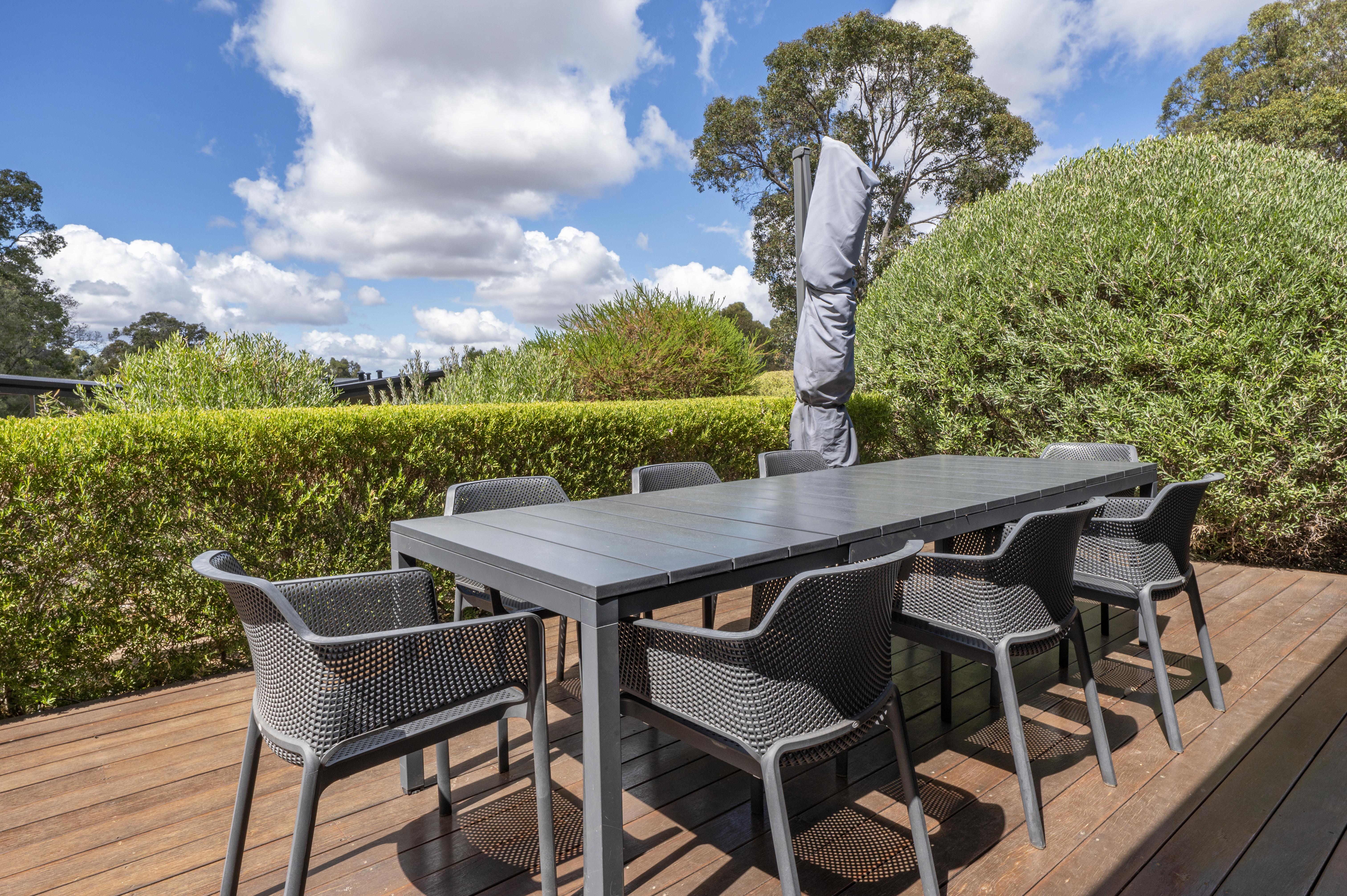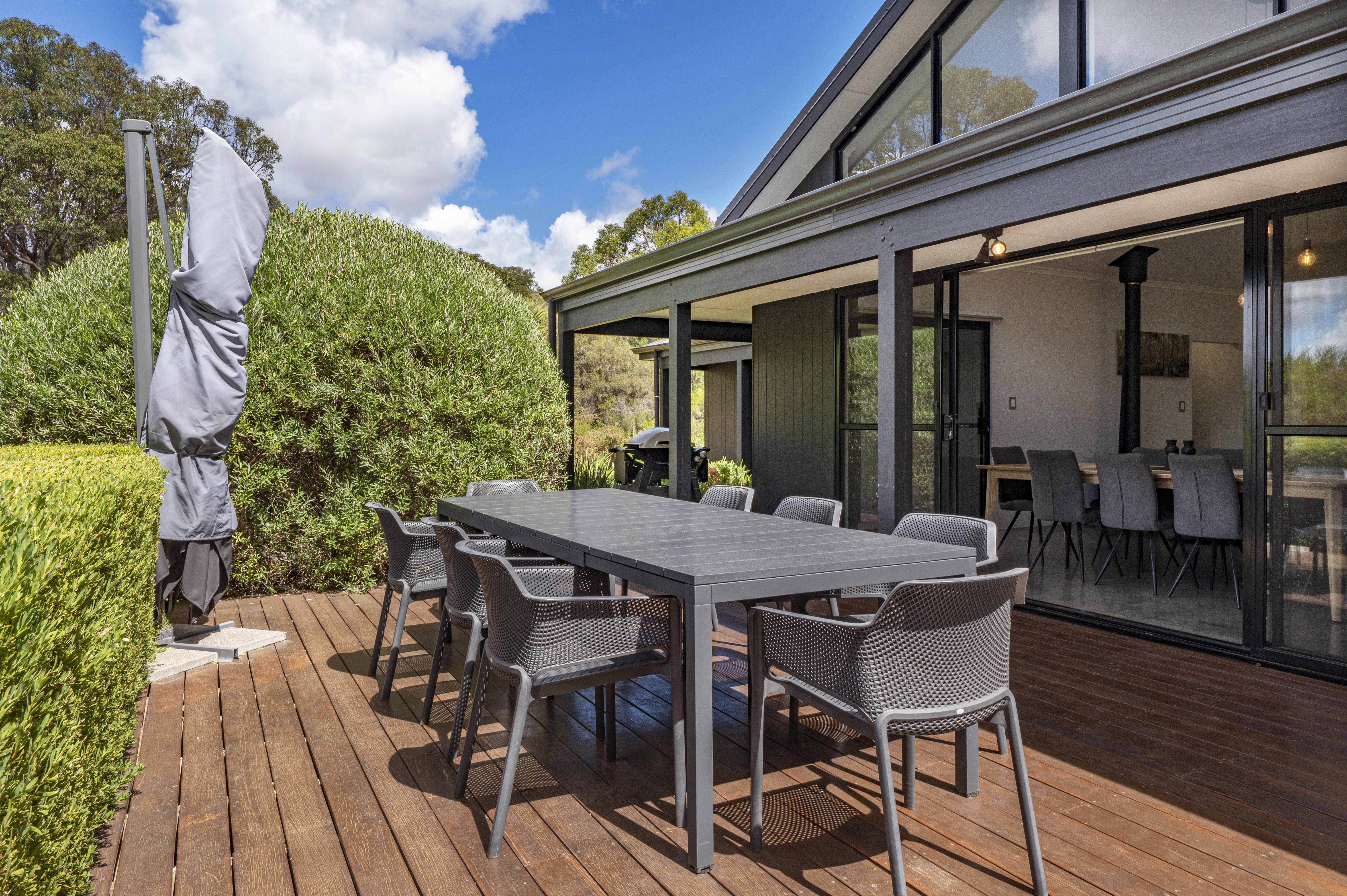 Step directly outside via glass sliding doors onto the large timber decked alfresco area that has lovely garden outlooks where you can enjoy a drop of local wine.