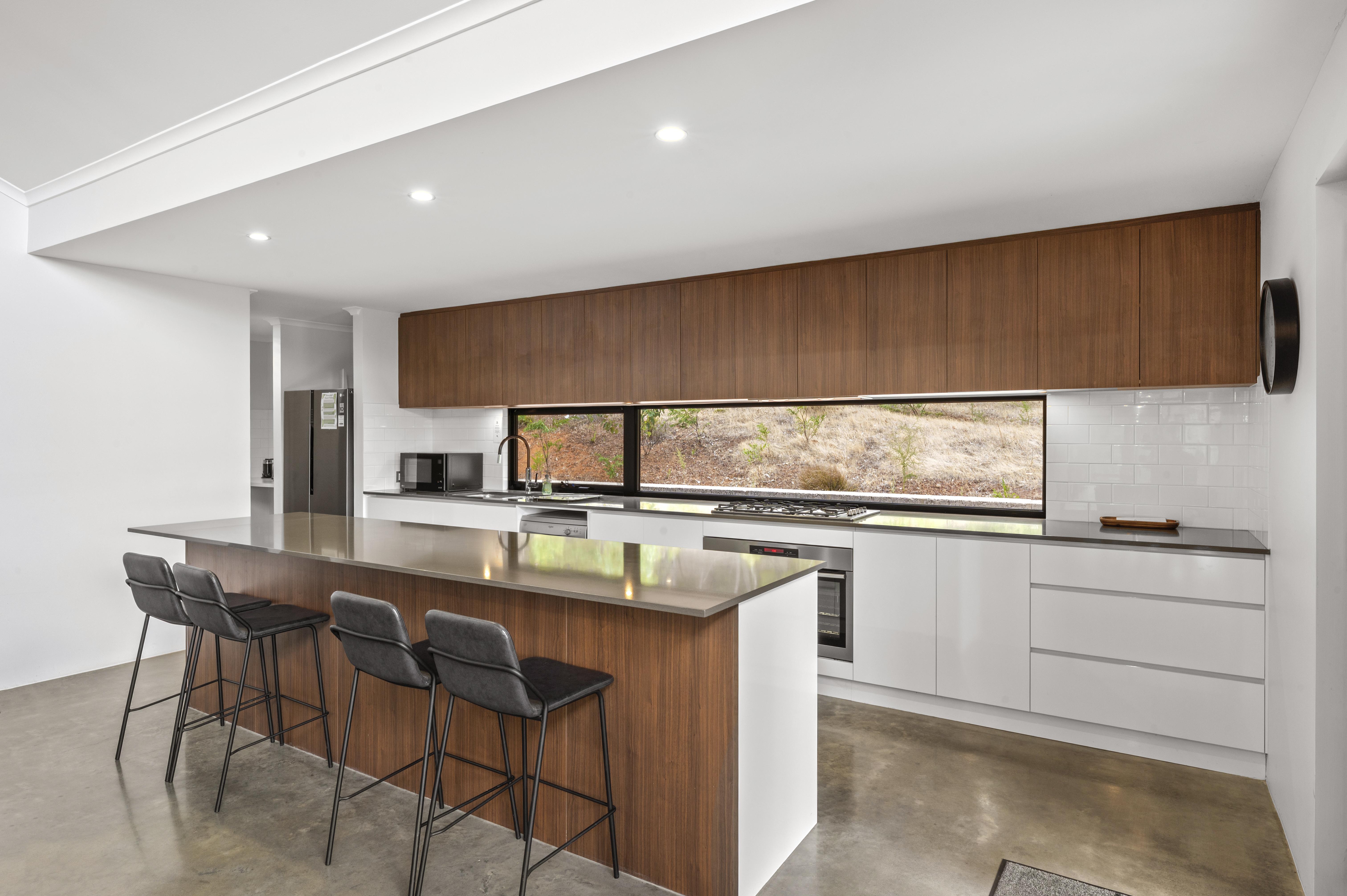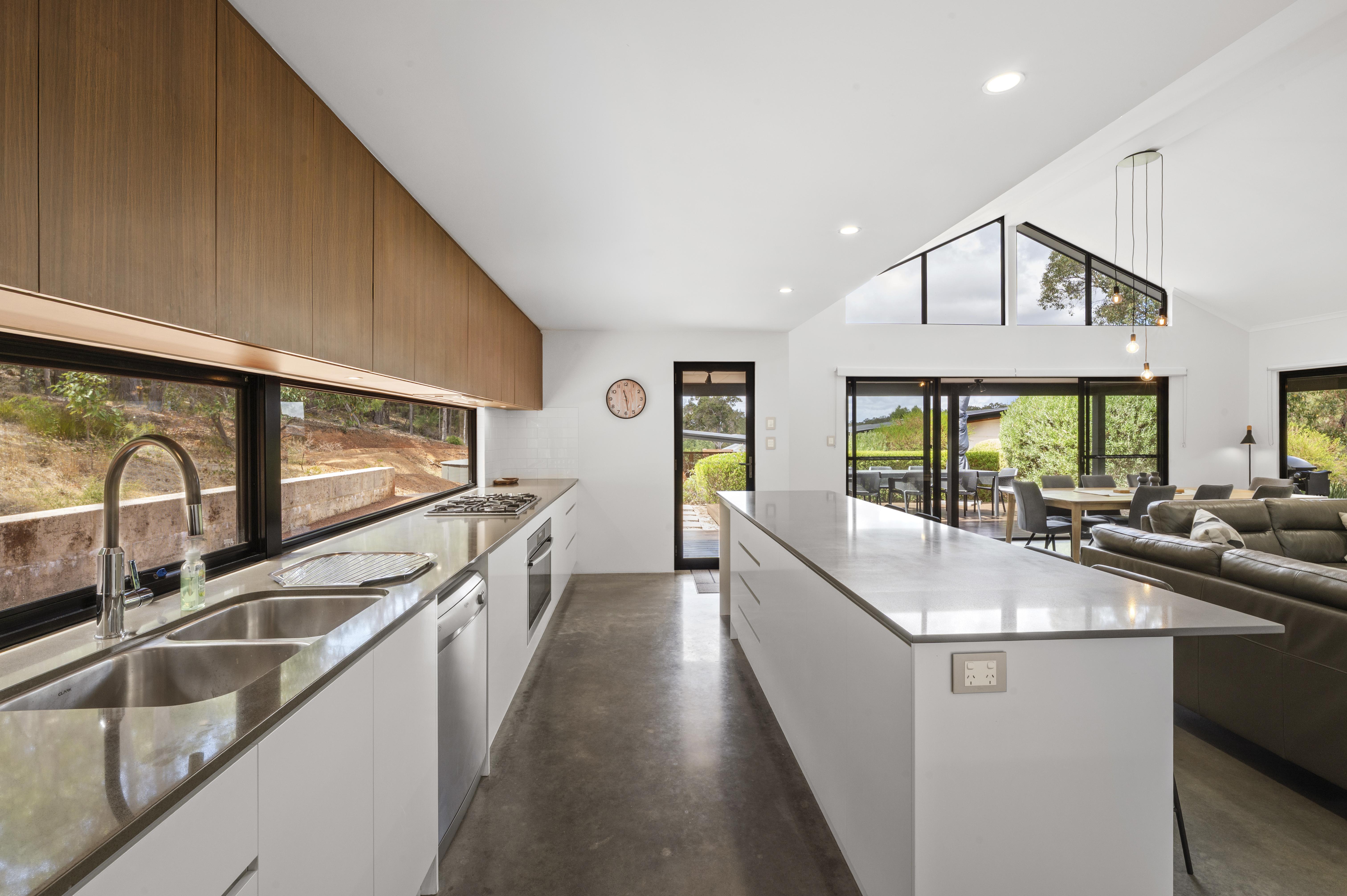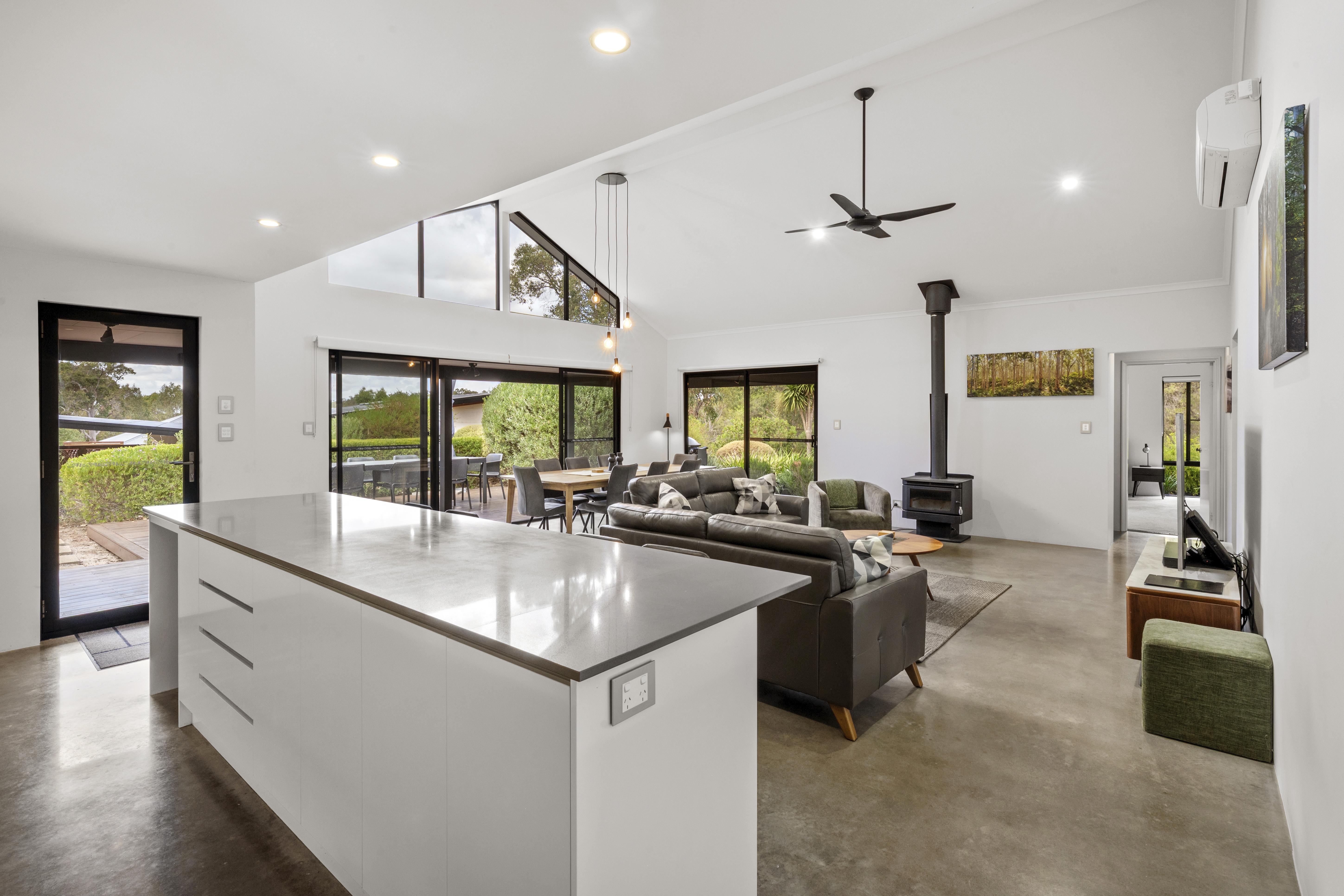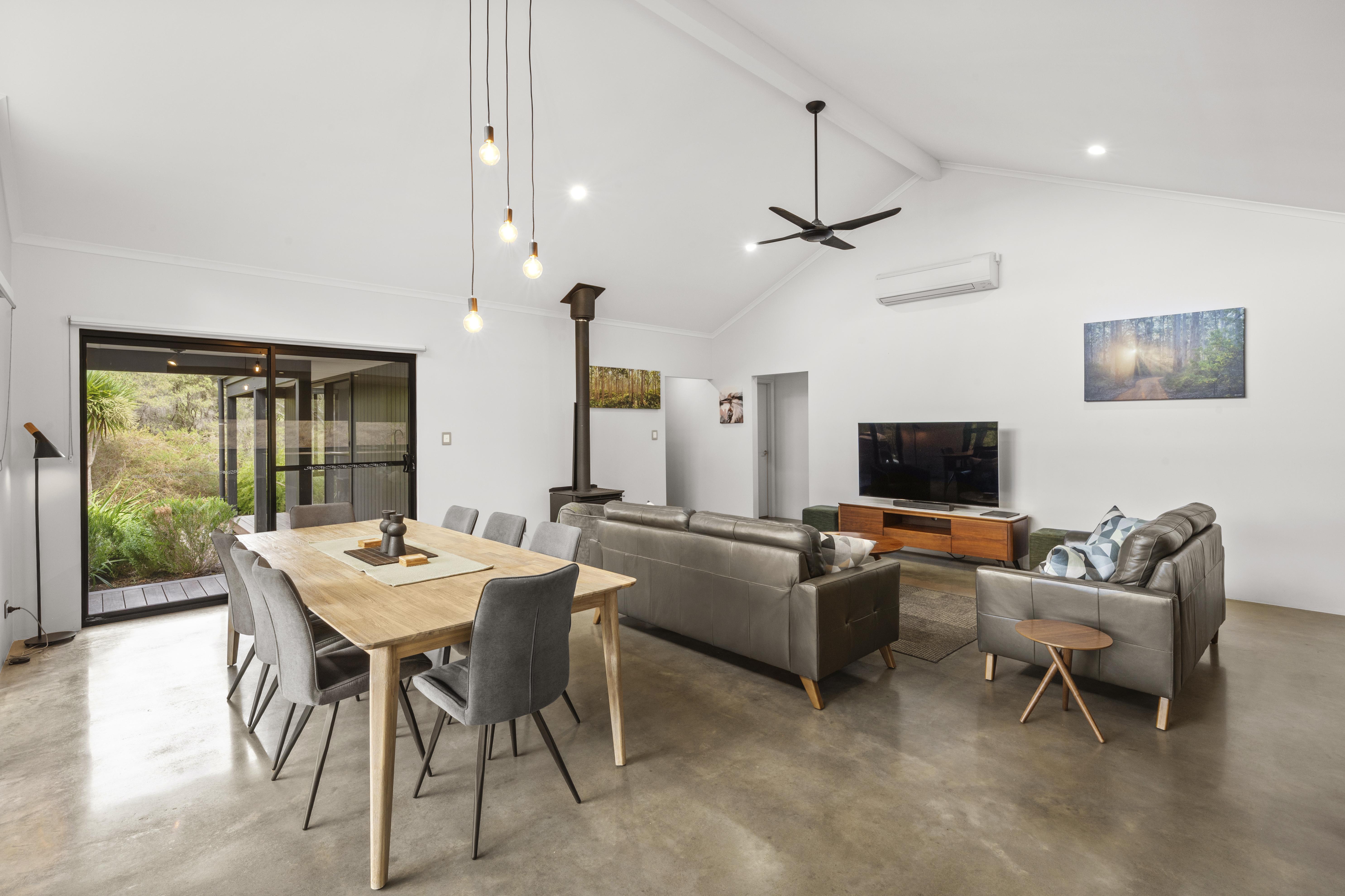 The spacious open plan design is centered around the free formed casual living zone that is highlighted with soaring ceilings, gorgeous pendant lighting, Reverse Cycle Air-conditioning, Wood Burning Heater, Ceiling Fans, polished concrete flooring & huge feature windows allowing plenty of natural light to flood in.
